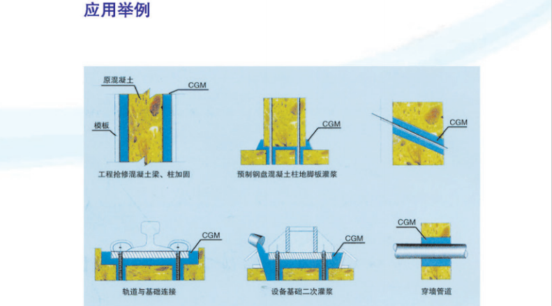 灌漿厚度30mm<δ<150mm設(shè)備基礎(chǔ)二次灌漿,地腳螺栓錨固,栽埋鋼筋,建筑物梁、板、柱、基礎(chǔ)和地坪的補(bǔ)強(qiáng)加固。